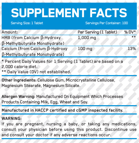 Everbuild Nutrition's HMB provides a clearly formulated dosage: 1 tablet per dose, and the package contains 100 doses. Ingredients: Calcium (from Calcium B-Hydroxy B-Methylbutyrate Monohydrate), HMB (from Calcium B-Hydroxy B-Methylbutyrate Monohydrate). It is recommended that the intake should not exceed the daily dose; consult a doctor if pregnant, breastfeeding or have medical prescriptions.