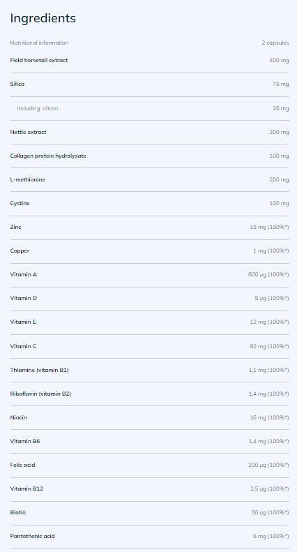Regular intake supports the strength of connective tissues, aids skin regeneration and maintains the vitality of nails and hair. The components work synergistically to maintain skin elasticity and the natural metabolism of beneficial substances, contributing to the overall health of ligaments, skin and hair.