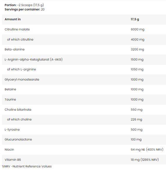 • Цитрулин малат и бета-аланин за повишена издръжливост и по-силно напомпване.