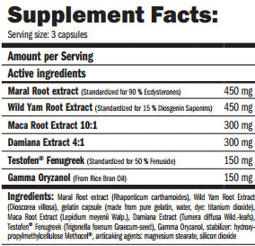 Leuzea is a well-known immune-boosting herb that can improve physical endurance and libido. Wild yam root contains phytohormones that improve hormonal balance. Peruvian maca is rich in amino acids and can support muscle growth and energy, and gamma-oryzanol from rice bran contributes to muscle mass gain and natural testosterone production.