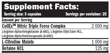 With a patented form of L-arginine, it controls nitric oxide levels in the body. L-arginine alpha-ketoglutarate (A-AKG) increases protein synthesis and supports the growth of lean muscle mass, while L-arginine ester promotes growth hormone production and improves the flow of oxygen and nutrients to the muscles. L-arginine alpha-ketoisocaproate (A-AKIC) is added, which helps build muscle tissue, neutralizes free radicals and strengthens the immune system.