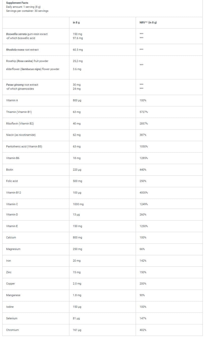 The combination of vitamins, minerals and natural ingredients is selected for good digestibility and a sustainable effect on muscle function, the body's protection against oxidative stress and maintaining energy flow throughout the day. One dose is 1 measuring spoon (8 grams), which is dissolved in 350 ml of water and taken once a day.