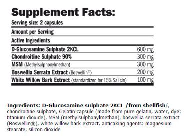 The formula combines glucosamine sulfate, chondroitin sulfate and MSM with boswellia and salicin to support joint and connective tissue health. Glucosamine is a major building block of joint tissue and cartilage, while chondroitin maintains their flexibility and strength. Boswellia is produced in India from the resin of the Boswellia serrata tree and supports normal blood supply to the joints. MSM provides organically bound sulfur for the maintenance of collagen fibers and antioxidant protection. Salicin from White Willow Bark is a natural form of aspirin and contributes to joint discomfort.