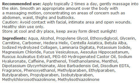 The formula features a highly effective combination of biologically active ingredients such as caffeine, carnitine, Gotu Kola and Thorny Leaf, which activate microcirculation and accelerate the metabolism of fat cells. This process helps reduce puffiness and visibly smooth out cellulite wrinkles on the body.