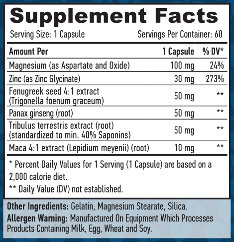 The formula combines active natural substances that work synergistically to maintain energy, normal blood sugar levels and increased libido. It includes fenugreek seeds standardized to 50% saponins in each capsule, Tribulus terrestris (an extract of the fruit known as the Mother's Tooth) and maca root, enriched with magnesium and zinc. These ingredients contribute to optimal health and better sports performance.