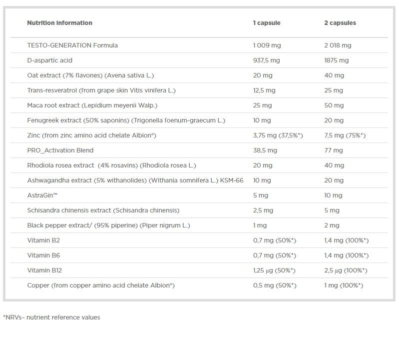 The ingredients include D-aspartic acid, maca root extract, oats and other natural components (such as ashwagandha KSM-66 and AstraGin) that work synergistically to increase testosterone levels, improve nutrient absorption and promote fat burning. One serving is 1 capsule, and the servings per package are 120 capsules, providing long-lasting support for the training process.