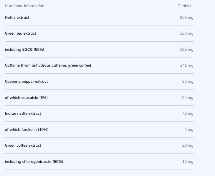 The composition includes nettle and green tea extract, caffeine anhydrous, cayenne pepper and SINETROL® – a patented extract of guarana and citrus, contributing to more efficient fat utilization and increasing strength and endurance.