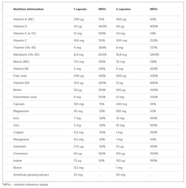 Vita-Min One contains carefully selected vitamins and minerals necessary for the normal functioning of the body. Each capsule delivers the exact daily doses of vital nutrients such as vitamins C, D, E, B-complex and minerals such as zinc, magnesium and selenium, which support the immune system, energy metabolism and antioxidant protection. The components work synergistically to maintain the normal state of the nervous system, bones and oxygen transport throughout the body.