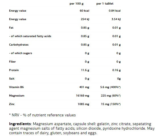 Combines magnesium citrate, zinc citrate and vitamin B6, providing high absorption and active support for musculoskeletal function. Magnesium supports normal muscle function, protein synthesis and proper recovery, as well as maintaining a healthy heart rhythm. Zinc is involved in numerous metabolic processes, supports reproductive health, the immune system and protects cells from oxidative stress. Vitamin B6 improves the absorption of magnesium and supports the metabolism of amino acids, thus supporting the overall metabolism of substances in the body.