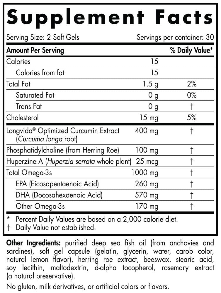 Omega-3 fatty acids EPA and DHA, along with phosphatidylcholine, support the structure and function of brain cells. Optimized curcumin and huperzine A support neuronal communication and help protect neurons by modulating the effects of oxidative stress. Cumulatively, these nutrients help protect, build, and restore cognitive function.