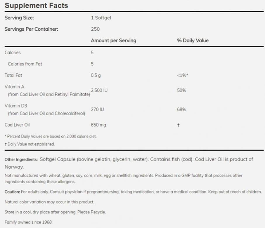 Cod Liver Oil 650 mg - 250 Gel capsules