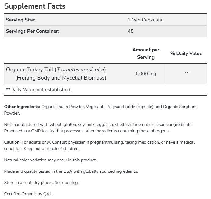 Ingredients: Turkey Tail (Trametes versicolor) extract – fruiting body and mycelial biomass