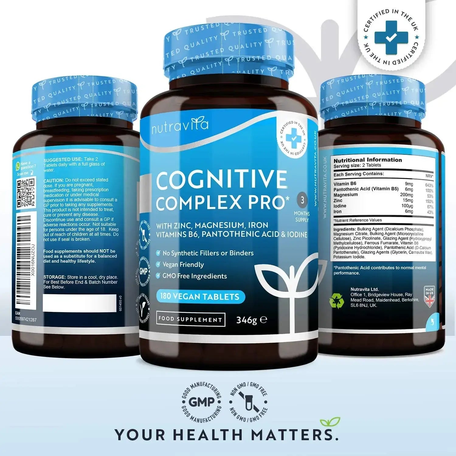 Cognitive Complex Pro is specially formulated to support cognitive health through a unique combination of essential nutrients. The content of pantothenic acid, zinc and iodine plays an important role in normal brain function. Vitamins B6 and magnesium promote psychological stability, while iron is key to cell energy metabolism. Backed by scientific research and approved by EFSA, our product offers multiple benefits for mental activity.
