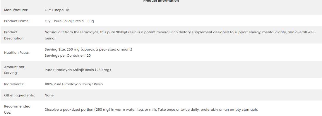 This Shilajit powder is easy to use - just add 1-2 grams to your favorite drink or food and enjoy the power of nature. With its 30 grams, you will have enough quantity to implement this element into your daily life.