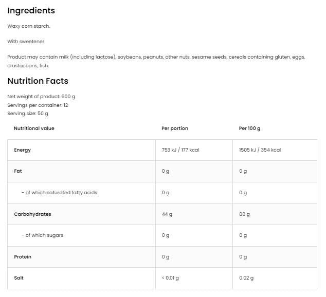 Directions for use: take ( 1 dose = 50g ) of OstroVit Waxy Maize dissolved in 200 ml of water 1-2 times daily, with the most appropriate time being immediately before training.