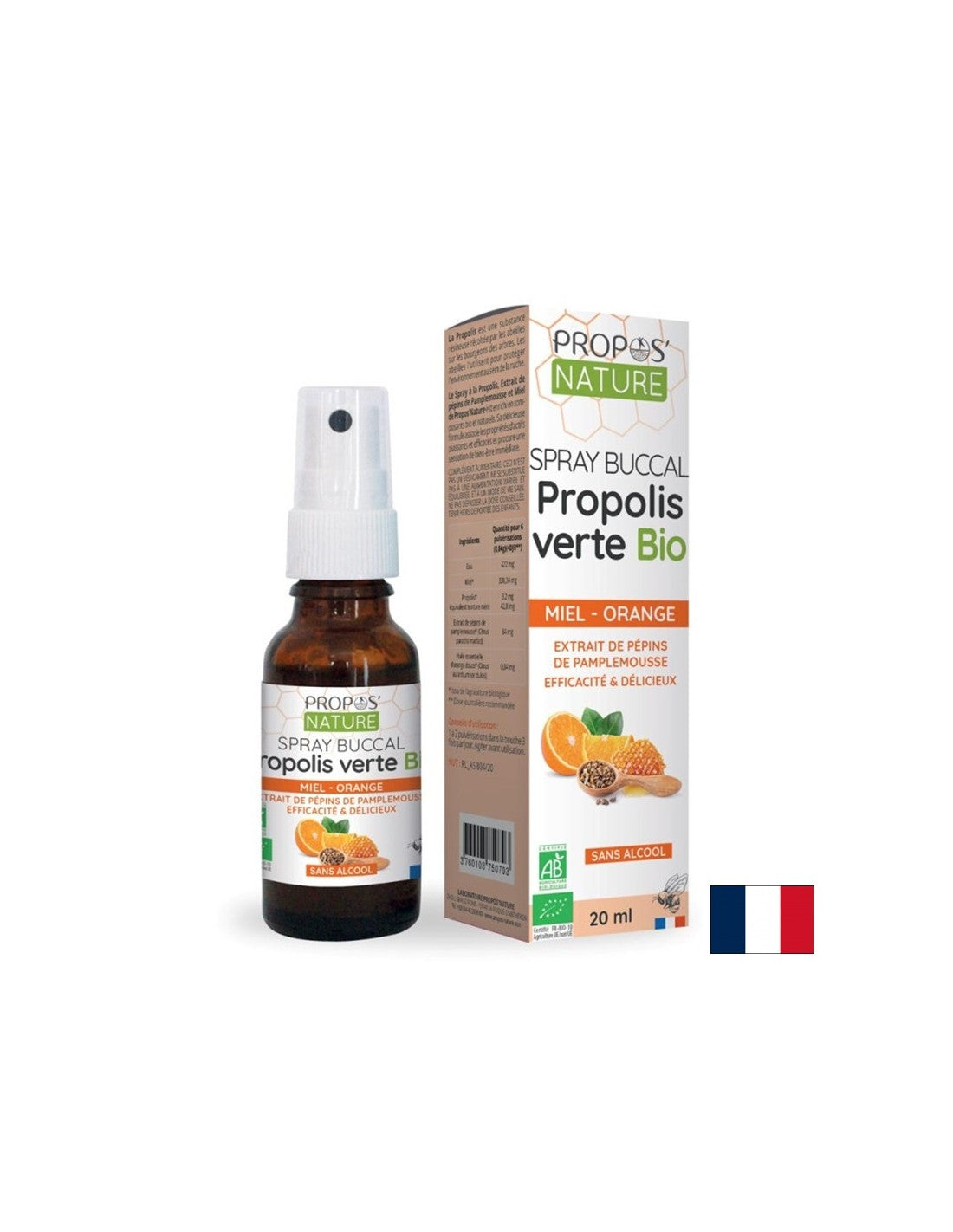 Spray Buccal Propolis Verte & Extrait De Pépins de Pamplemousse Bio, Miel & Orange / Throat spray with propolis extract, grapefruit (seeds), honey and orange, 20 ml is a food supplement from the French company Propos'Nature. The formula includes propolis, grapefruit seed extract, Vitamin C, honey and sweet orange essential oil /Citrus aurantium dulcis/. The product contributes to the normal condition of the upper respiratory tract and throat.