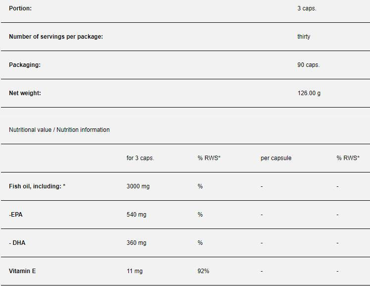 Sport Definition Omega 3 Strong - a professional supplement, each serving of which contains up to 900 mg of a mixture of eicosapentaenoic acid (EPA) and docosahexaenoic acid (DHA) of natural origin. They are characterized by good bioavailability/bioavailability and a positive effect on many aspects of the functioning of the human body. The modern human diet is often low in fatty fish, which leads to a deficiency and insufficient supply of omega 3 acids. To support the body, it is recommended to change the diet or use professional supplements, e.g. the offered product. Adequate supply of DHA promotes proper vision and proper functioning of the entire nervous system. EPA and DHA help maintain normal blood pressure and regulate the level of triglycerides in the blood. Of course, we cannot forget about the good condition of the heart and the entire circulatory system.
