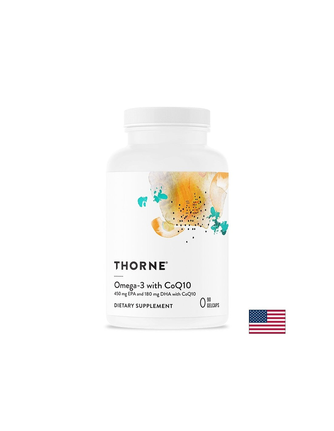 Omega-3 with CoQ10 от Thorne съчетава ключовите EPA (ейкозапентаенова киселина) и DHA (докозахексаенова киселина) – основните омега-3 мастни киселини, извлечени от чисто рибено масло с CoQ10 – мастноразтворим антиоксидант, който участва в производството на енергия в клетките. Тази комбинация осигурява по-добра усвояемост на коензим Q10, тъй като той се абсорбира по-ефективно в присъствието на мазнини.
