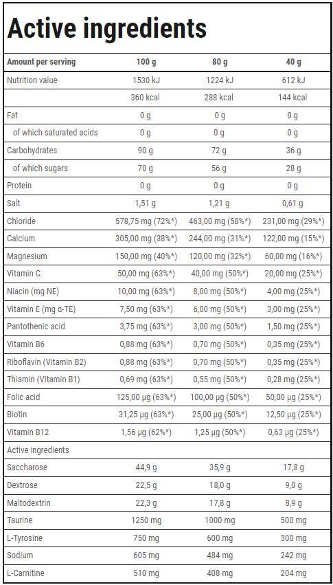 Isotonic Sport Endurance is a formula of energy components, minerals and vitamins selected for rapid rehydration of the body. Carbohydrate-electrolyte solutions improve water absorption during physical exercise and contribute to maintaining endurance during prolonged exertion. ISOTONIC SPORT contains the minerals sodium, chloride, calcium and magnesium, which help maintain electrolyte balance. ISOTONIC SPORT also contains L-carnitine, taurine and a complex of B vitamins, including vitamin B6, which contributes to the reduction of tiredness and fatigue. ISOTONIC SPORT is recommended for endurance and strength athletes.