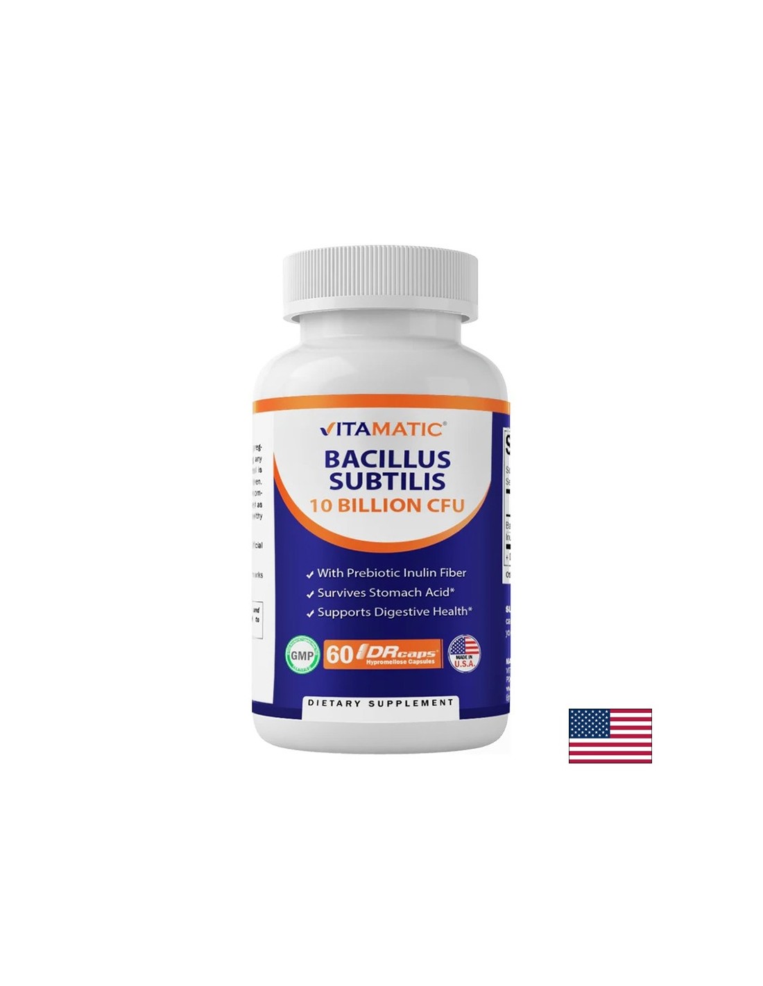 Contains 10 billion active live cultures of Bacillus subtilis and 300 mg of inulin to support healthy gut flora and strong immune function. With delayed release for optimal action without stomach irritation
