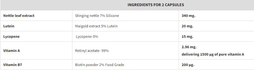 ВИТАМИН В7 – ЛУТЕИН – ВИТАМИН А – ЛИКОПЕН – КОПРИВА е хранителна добавка, и благодарение на естествения си и абсолютно безвреден състав от натурални продукти е чудесно средство за цялостната грижа и доброто състояние на косата, кожата и ноктите. Чрез приема на този продукт и благодарение на силния му многофункционален и антиоксидантен ефект, вие ще подобрите ефикасно собствената си имунна защита срещу различни видове микози, бактериални инфекции и кожни проблеми като пъпки, акне и херпес, както и отлично ще повлияе за възстановяването на лигавиците и развитието на костите и зъбите, жизнеността, издръжливостта и силата на мускулите.
