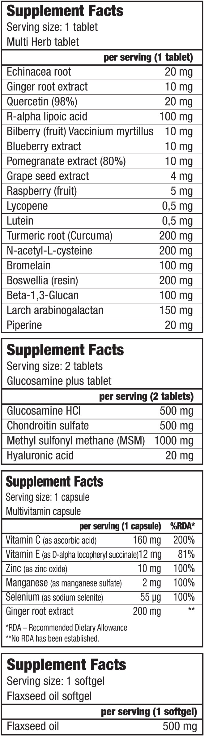 The special herbal blend includes ginger, grape seed, pomegranate, echinacea, flaxseed oil and boswellia, which supports immunity, relieves inflammation and helps reduce fatigue and stress, while also helping with muscle and joint pain. The product contains zinc and manganese for healthy bones and joints, vitamin E for antioxidant protection, and vitamin C supports collagen formation.
