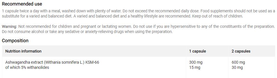 The active extract of ashwagandha supports adaptation to various types of stress (physical, mental and environmental), supports the immune system and has an anti-inflammatory effect. One dose is 1 capsule; the package contains 60 capsules, which provides 30 doses. Ingredients: ashwagandha extract.