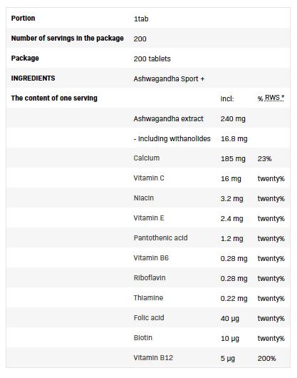 One serving of Ashwagandha Sport + is designed to support your daily endurance and post-workout recovery, reducing feelings of fatigue and stress. The combination of ashwagandha extract and vitamin complex serves to provide more comprehensive support for the body, facilitating adaptation to a busy regimen and supporting natural vitality.