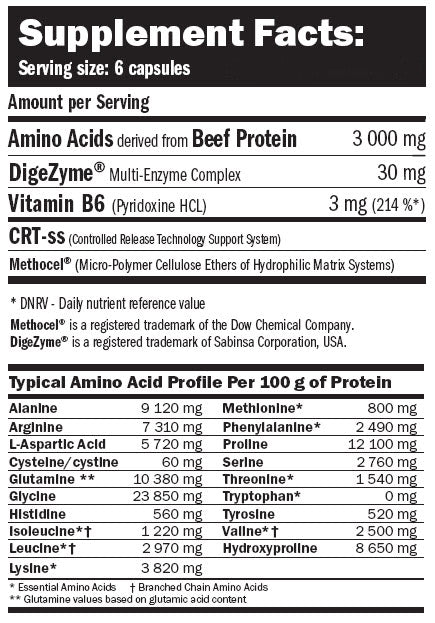 This formula delivers a well-balanced set of amino acids, which are essential for protein synthesis and maintaining nitrogen balance. The amino acids are derived from beef with high biological activity and thus support the building of muscle mass, strength and endurance during training.
