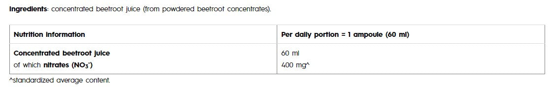 Beetroot juice is known for its nitrate content, which is converted into nitric oxide in the body. This helps dilate and relax blood vessels, which facilitates the delivery of oxygen to the muscles during activity. Beetnox Shot is a compact glass ampoule that is easy to carry in your gym bag and convenient for daily intake. For full benefits, daily use is recommended for at least 6 days. One dose is 1 ampoule (60 ml).