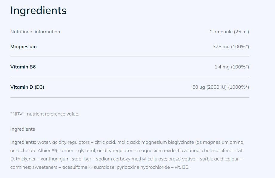 OLIMP Chela Mag B6 + D3 Forte Shot is an effective bioactive complex of organic magnesium chelate and vitamins D3 and B6 in liquid form, which helps maintain normal levels of magnesium and vitamin D3 and reduces their deficiency.