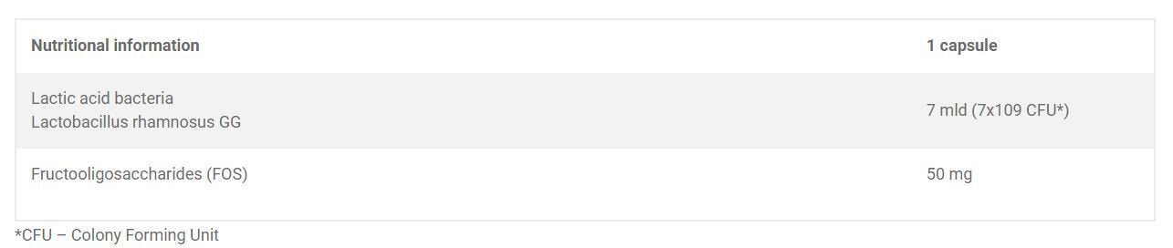 A properly balanced intestinal microbiota is essential for our health. Lactobacillus rhamnosus GG at a concentration of 7 billion (7x109 CFU*) – is responsible for replenishing the intestinal microbiota, especially during antibiotic therapy, 2-3 weeks after stopping antibiotics, during the use of medications (e.g. popular non-steroidal anti-inflammatory drugs and painkillers), hormones, stimulants (such as alcohol and tobacco), or after viral infections or the intake of unhealthy food containing pathogenic chemical agents and free radicals that destroy health. promoting strains of bacteria.
