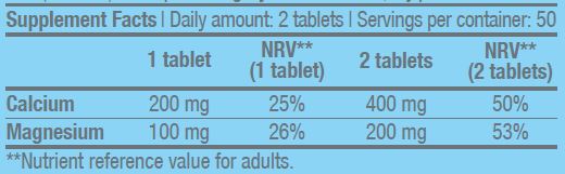 • 200 mg of calcium and 100 mg of magnesium in a 2:1 ratio – optimal formula for bones and nervous relaxation