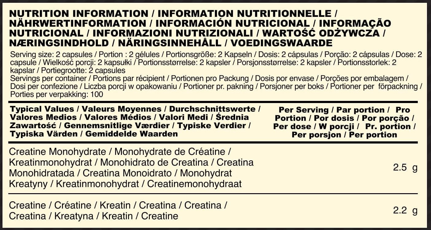 Each two capsules contain 2500 mg of 99.9% pure CreaPure™ creatine monohydrate, proven for rapid digestion and maximum absorption. One dose is 2 capsules. Packages are available with different number of doses: 50, 100 and 150. The capsules are easy to swallow and are suitable for regular intake throughout the training cycle.