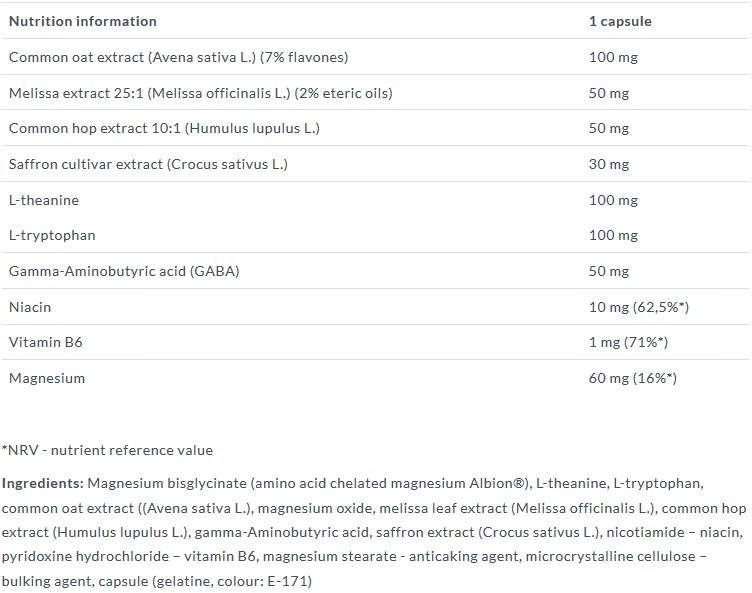 Ingredients: Magnesium bisglycinate (amino acid chelated magnesium Albion®), L-theanine, L-tryptophan, oat extract ((Avena Sativa L.), magnesium oxide, lemon balm leaf extract (Melissa Officinalis L.), hop extract (Hops vulgaris L.), gamma-aminobutyric acid, saffron extract (Crocus sativus L.), nicotiamide - niacin, pyridoxine hydrochloride - vitamin B6, magnesium stearate - anti-caking agent, microcrystalline cellulose - filler, capsule (gelatin, color: E-171)