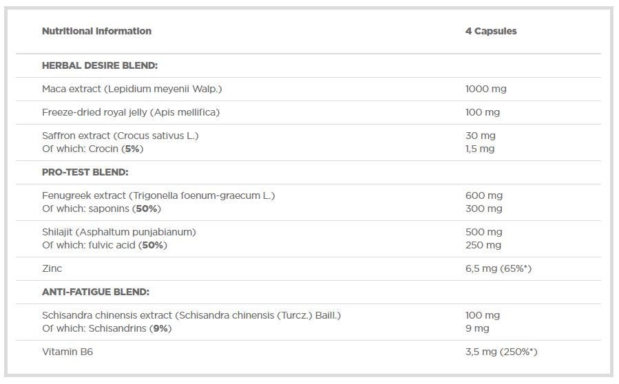 Fortest is a formula based on plant extracts and nutrients that works through the synergy of maca, saffron and zinc to maintain normal testosterone levels and optimal sexual function. The supplement also includes lyophilized royal jelly, as well as Shilajit and Schisandrins from Chinese lemongrass, which help with energy, recovery and maintaining strength performance during training.