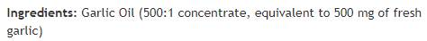 Състав: Масло от Чесън (500:1 концентрат, равняващ се на 500 mg пресен чесън). Препоръчителна употреба: Като хранителна добавка, приемайте една капсула два до три пъти на ден с вода.