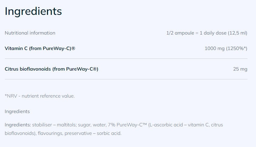 The patented PureWay-C formula combines L-ascorbic acid and citrus bioflavonoids for better absorption of vitamin C in the body. One ampoule contains 2000 mg of vitamin C, making it easy to effectively supplement your daily intake.