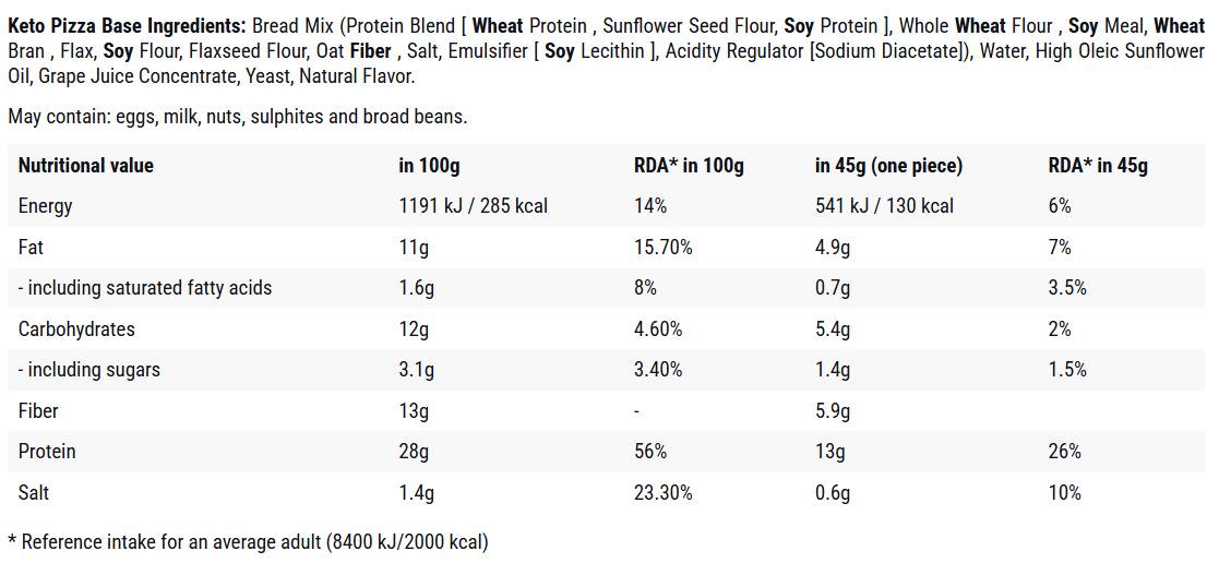 Keto Pizza Base е отличен избор за тези, които искат да се грижат за балансираната си диета, но не искат да се отказват от любимите си ястия. Благодарение на високото съдържание на протеин и ниското съдържание на въглехидрати, всяка пица, приготвена с тази основа, ще бъде перфектно хранене след тренировка или за вечеря. Просто добави любимите си съставки, постави в печката и след няколко минути ще се наслаждаваш на хрупкава, вкусна пица без никакви угризения. Освен това, високото съдържание на фибри подпомага здравословното храносмилане и осигурява дълготрайно усещане за ситост – нещо, което е от съществено значение в кето диетата.