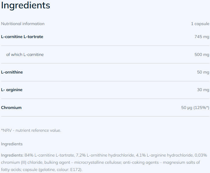 L-carnitine is a natural transport agent for fatty acids that helps the body convert fat into energy during training and intense exercise. The product contains complementary ingredients that enhance fat metabolism and stimulate growth hormone for more effective body shaping. Supports heart and general health, improves glucose tolerance and maintains good energy throughout the day.