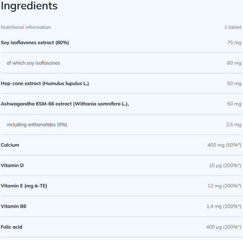 The effectiveness of the formula is based on the synergy between natural extracts and vitamin components. Soy isoflavones support normal hormonal balance, and common hop extract contributes to the relief of hot flashes and mood swings. Components such as vitamin D, vitamin E and B vitamins work together to support bone health, energy and general well-being during the transition.