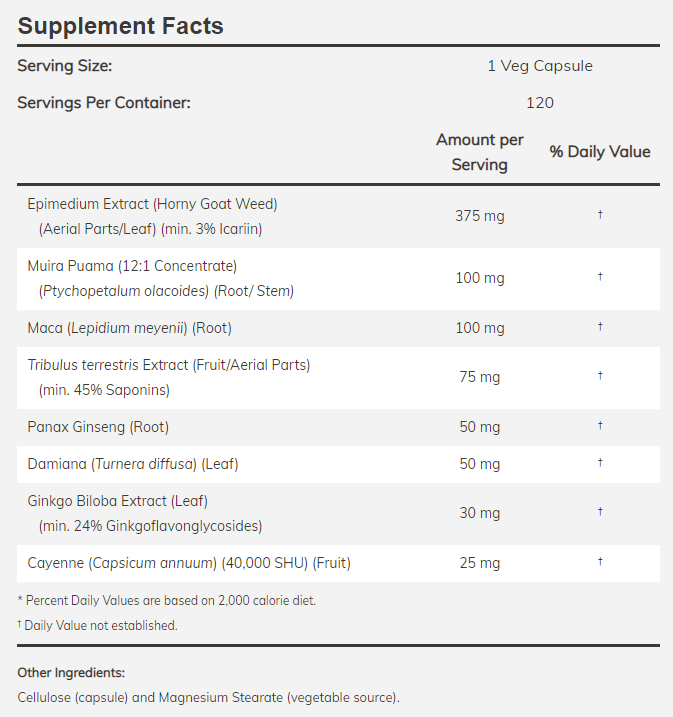 • Includes Tribulus Terrestris, Maca, Asian Ginseng, Ginkgo Biloba and other herbs