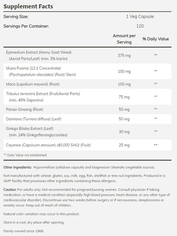 Mens Virility Power is scientifically formulated to achieve high levels of libido through a synergy of herbal extracts. Tribulus Terrestris, Maca Maca, Asian Ginseng and Ginkgo Biloba work together to increase circulation and hormonal balance, which supports erections, stamina and an overall sense of vitality. Horny Goat Weed and Damiana extracts enhance male libido and energy, making the product a preferred choice for active men.