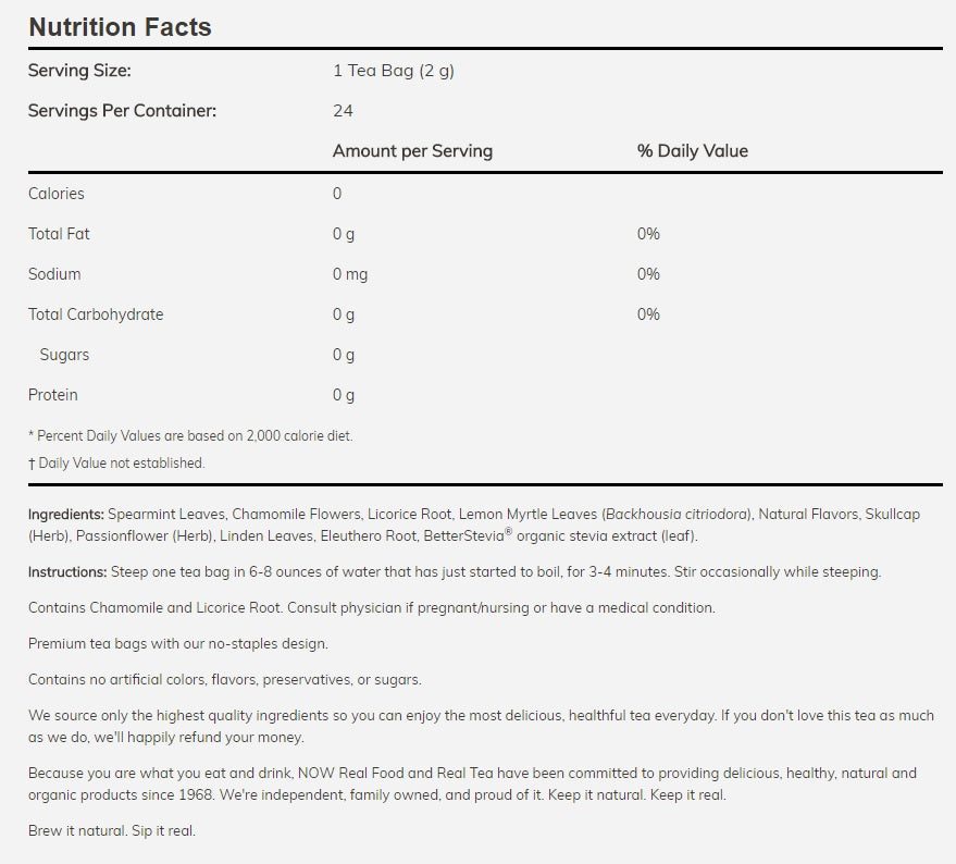 Nighttime™ Tea by NOW Foods is a natural herbal tea that works synergistically to help you fall asleep more easily and get a good night's sleep. In Nighttime™ Tea, you'll find ginger, chamomile, Siberian ginseng, and other natural active ingredients that help your body relax and your mind calm down at the end of the day.