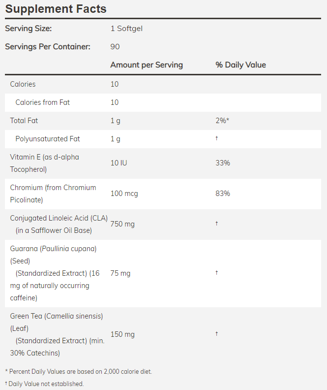 CLA Extreme contains conjugated linoleic acid (CLA), chromium picolinate, L-carnitine, green tea and guarana. This combined action directs the metabolism to help reduce body fat, while simultaneously supporting your energy endurance and overall health. CLA reduces enzymes responsible for increasing fat cell size, while L-carnitine helps transport fat to the mitochondria for burning. Chromium picolinate helps stabilize blood sugar and reduce the accumulation of subcutaneous fat. Green tea and guarana increase alertness and support metabolism through caffeine.
