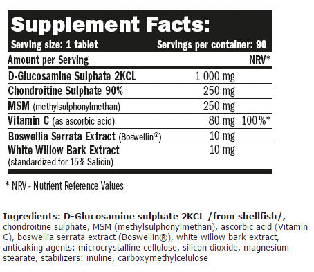 The synergistic formula combines glucosamine, chondroitin and MSM, supplemented with salicin, vitamin C and Boswellin® (Boswellia). This composition helps maintain healthy joints, improves mobility and reduces discomfort during exertion.