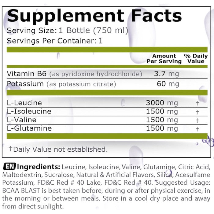 Branched-chain amino acids are essential for the body because it cannot produce them on its own and must be obtained from food and supplements. BCAA Blast also contains added glutamine, an important amino acid that works synergistically with branched-chain amino acids and improves muscle fiber recovery and growth.
