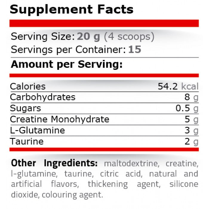 CGT BLAST works through the synergy of three main components: creatine monohydrate, glutamine and taurine. Creatine increases ATP synthesis, which improves strength, explosiveness and recovery time between sets. Glutamine supports the immune system, muscle tissue recovery and reduces the risk of catabolism after intense exercise. Taurine improves nerve function and helps better absorption of other ingredients, contributing to faster recovery and reduced muscle tension. The combination of the three active ingredients makes CGT BLAST useful for building strength, mass and better training efficiency.