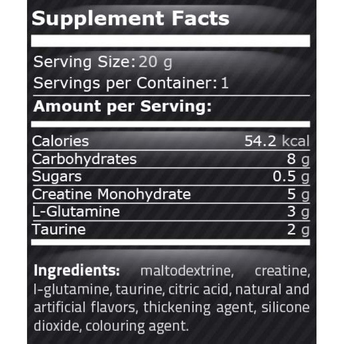 CGT Blast is a complex formula created for serious trainers. Creatine monohydrate increases energy stores in muscle cells, improves strength, explosiveness and recovery time between sets. Glutamine is the most abundant amino acid in the body and supports immune function, the digestive system and tissue repair, protecting muscle tissue from breakdown after heavy exertion. Taurine improves the transmission of nerve impulses and supports nerve recovery function, contributing to better absorption of creatine and glutamine in muscle cells.