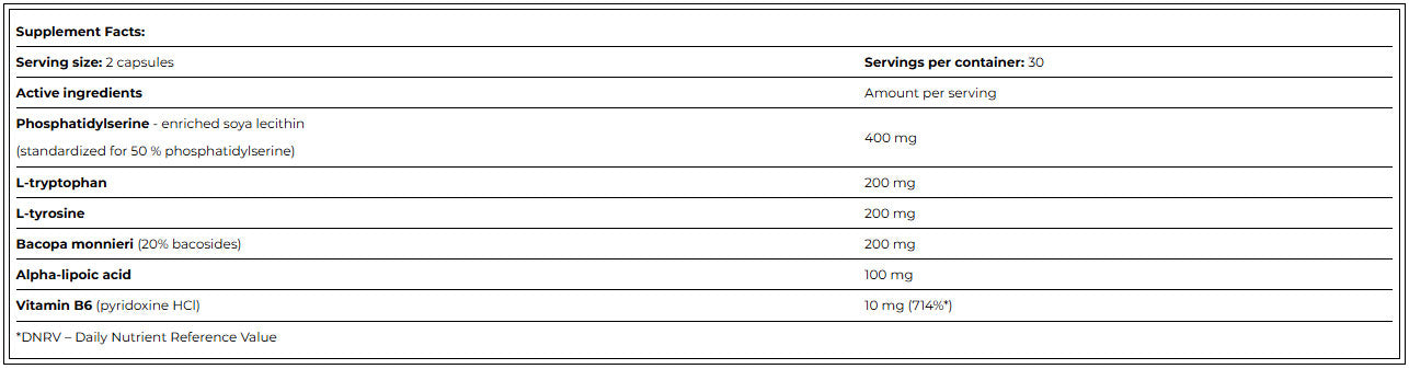 L-tyrosine and L-tryptophan support metabolic processes and protein synthesis, balance high blood pressure and have a calming and invigorating effect on the body. The recommended intake is 1 capsule with a light meal before physical activity and 1 capsule before sleep, which supports energy levels and recovery during different phases of the training regimen.